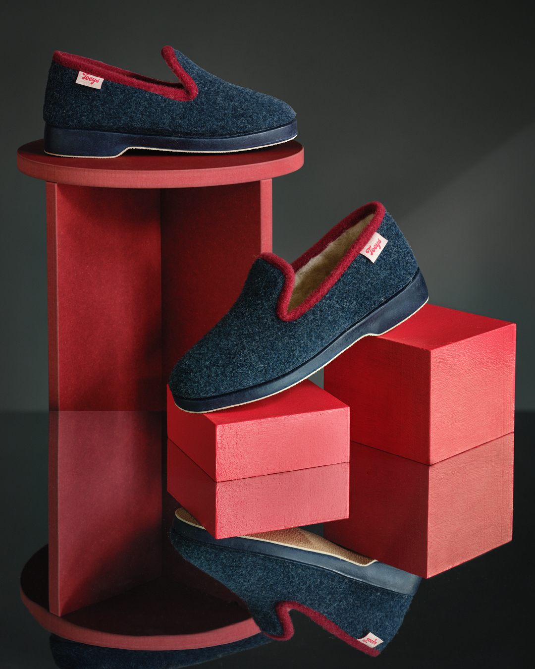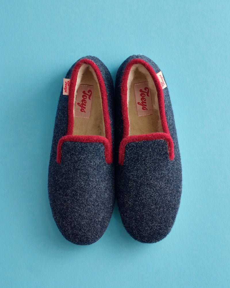 Med sin röda kant är våra blå tofflor perfekta för dig som vill addera en färg klick i vardagen. De har en tjock sula i gummi vilket ger dem en snygg profil men även tillåter dig att använda dem utomhus. Perfekta både för att slappa hemma med såväl som ett snabbt ärende på stan. Tofflorna har även ett varmt och skönt innerfoder i ull som håller dina fötter varma under vinterhalvåret. Njut av komfort samtidigt som du får en lekfull och snygg look med ett par Toeys på fötterna.